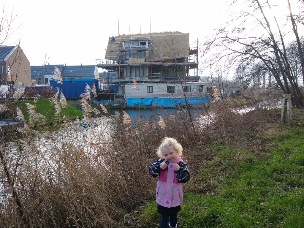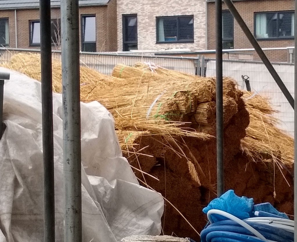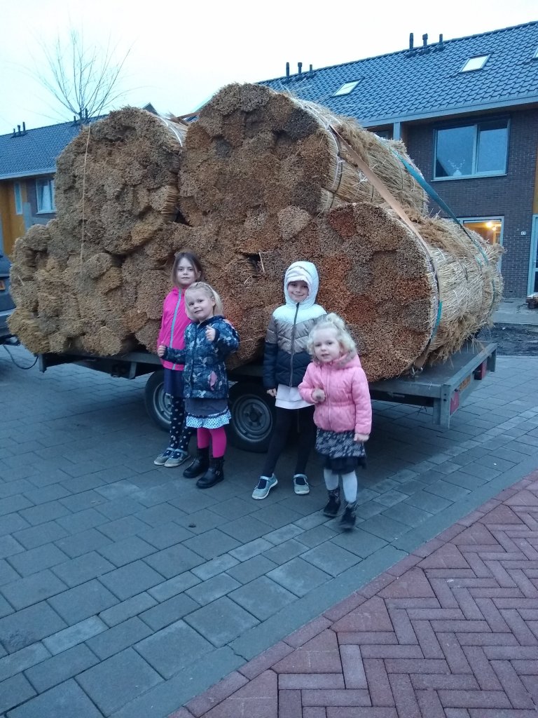En daar staat hij dan. De eerste aanhangwagen vol met balen riet. Een mijlpaal voor ons! Even snel een foto maken.. Gaaf dat dit op ons dak komt! Bij terug komst van school zijn de rietdekkers al in volle gang. Overal ligt riet. En dan roept je dochter “bah het stinkt hier naar paarden!!”